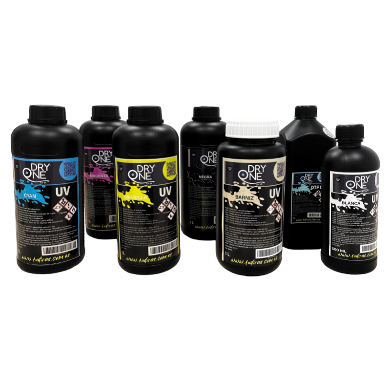 Tintas UV aptas para su uso en la técnica DTF UV (Direct Transfer Film) y para impresoras UV. Los colores son brillantes y tienen buenas capacidades anti-sol y anti-humedad para ser duraderos e intensos.